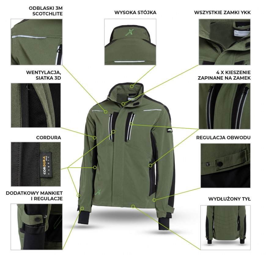 Odzież robocza dedykowana najbardziej wymagającym użytkownikom. Już na pierwszy rzut oka zaskakuje modną stylistyką i estetycznym wykonaniem. Ubiór powstał przy współpracy z profesjonalistami z branż dla których spodnie są dedykowane, dlatego każdy szczegół idealnie spełnia swoją funkcję. Do szycia spodni wykorzystano wysokiej jakości elastyczny materiał o charakterystyce softshellu. Dodatkowo w spodniach zamontowano aktywny pas z podwyższonym stanem z tyłu. Dzięki temu komfort użytkowania jest wysoki nawet przy wielogodzinnej pracy w wymuszonej pozycji. Dodatkowo wykonano otwory wentylacyjne odpinane na zamek, które pozwalają na wypuszczanie nadmiaru wilgoci i ciepła.