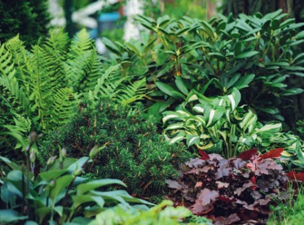Planując rabaty czy inne nasadzenia w cieniu, warto sięgać po rośliny o zróżnicowanej wysokości. Niższe i barwniejsze warto usytuować bliżej ścieżek, natomiast wyższe oraz jednolite kolorystycznie wykorzystajmy jako ich tło. Duży wpływ na atrakcyjność aranżacji mają kształt, pokrój, faktura i kolorystyka liści oraz barwa kwiatów czy owoców – jasne i soczyste odcienie rozświetlą i ożywią tonące w mroku zakątki ogrodu. Godne uwagi są cieniolubne byliny. Te z grupy zadarniających będą pięknie wyglądać pod drzewami oraz tam, gdzie nie ma szans na bujny trawnik. Mogą to być barwinek pospolity, bluszcz pospolity, dąbrówka rozłogowa czy gajowiec żółty i konwalia majowa. Na rabaty z długiej listy cieniolubnych bylin warto wybrać funkie, paprocie, bergenię sercowatą, fiołek wonny, dziurawiec, tawułkę Arendsa oraz ciemierniki. Ich ozdobą będą też kosaciec syberyjski, szafirki czy jaskier ogrodowy oraz zawilec leśny. W budowaniu kompozycji dobrze jest wykorzystać pnącza np. bluszcz pospolity, niektóre odmiany powojników czy kokorniak wielkolistny. Zakątki wymagające rozjaśnienia ozdóbmy kwitnącymi na biało przywarką japońską lub hortensją pnącą. W cieniu świetnie sobie poradzą liczne krzewy i drzewa. Do bardzo ozdobnych należą cisy: pospolity i pośredni. Okazy żeńskie obsypują jaskrawoczerwone nasiona pięknie kontrastujące z zielenią igieł. Chętnie wykorzystywane są także mahonia pospolita, laurowiśnia wschodnia, azalia japońska, hortensje – bukietowa, dębolistna i ogrodowa – czy kalina sztywnolistna.